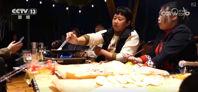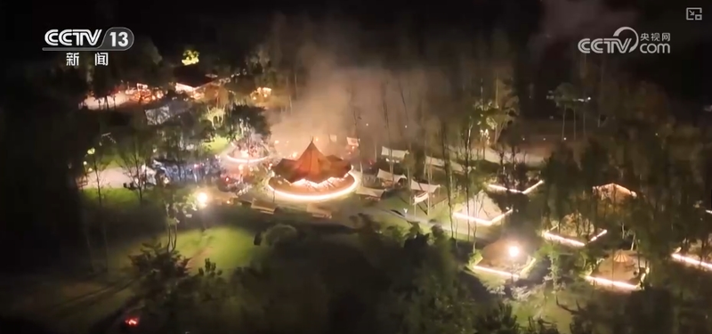 在湖北咸宁,车埠镇鸡公山村的一处营地基地,草地上音乐萦绕,游客们带着孩子和宠物在这里野餐露营,开启欢乐烧烤派对,体验户外“慢生活”。