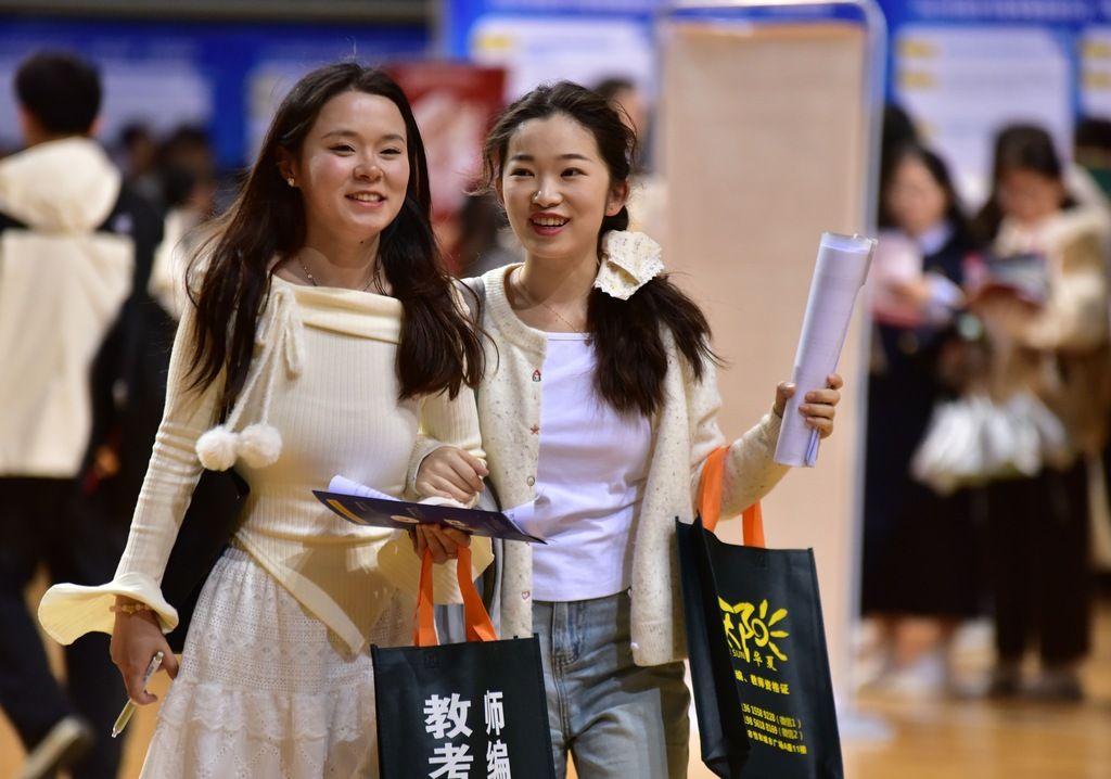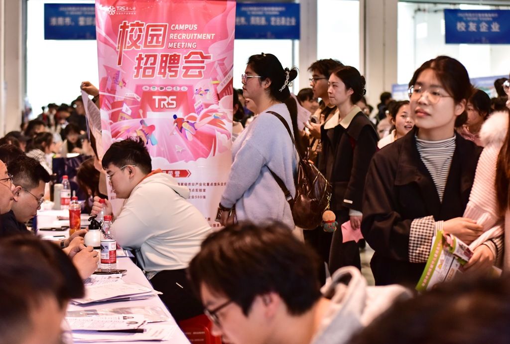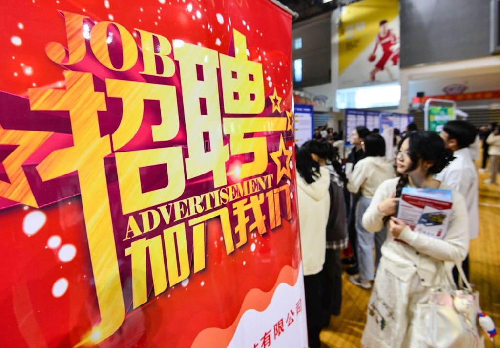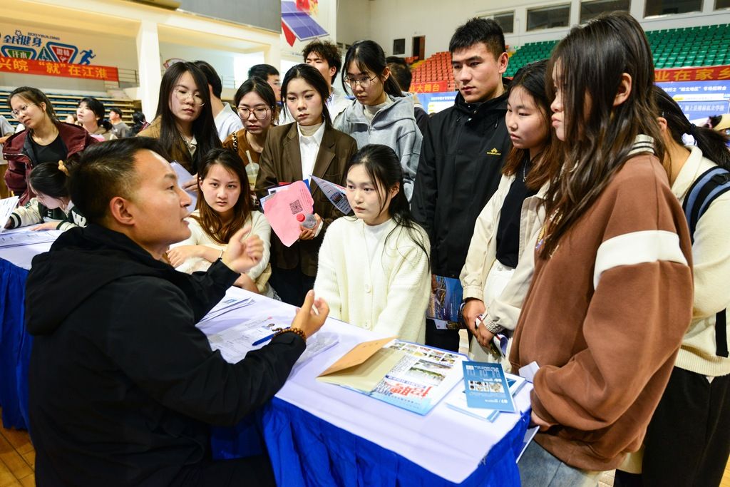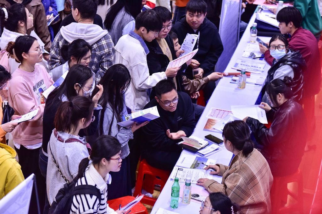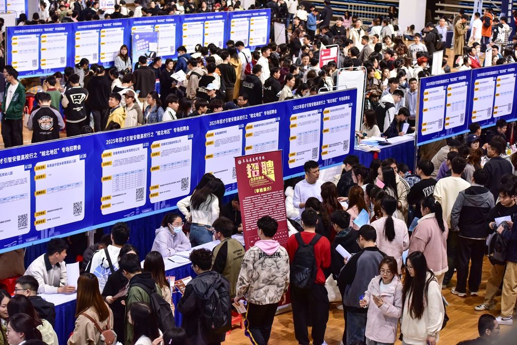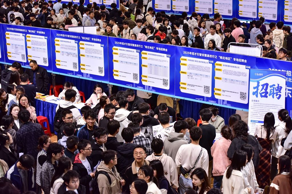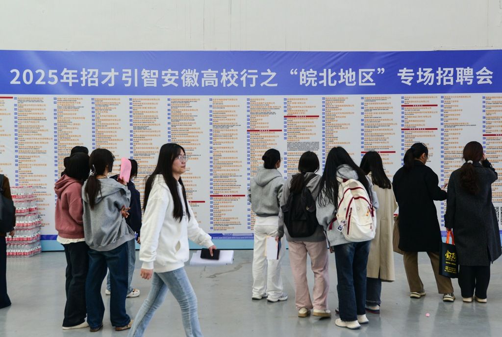 2025年3月22日,在安徽阜阳师范大学西湖校区体育中心,求职学生参加专场招聘会。