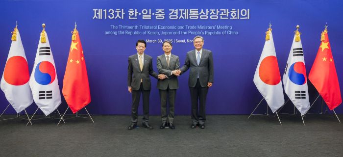 3月30日,第13次中日韩经贸部长会议在韩国首尔举行。商务部部长王文涛与韩国产业通商资源部长官安德根、日本经济产业大臣武藤容治共同主持会议。会议围绕落实第九次中日韩领导人会议经贸领域重要共识,就加强贸易投资合作、区域及多边合作等深入交换意见,达成广泛共识。