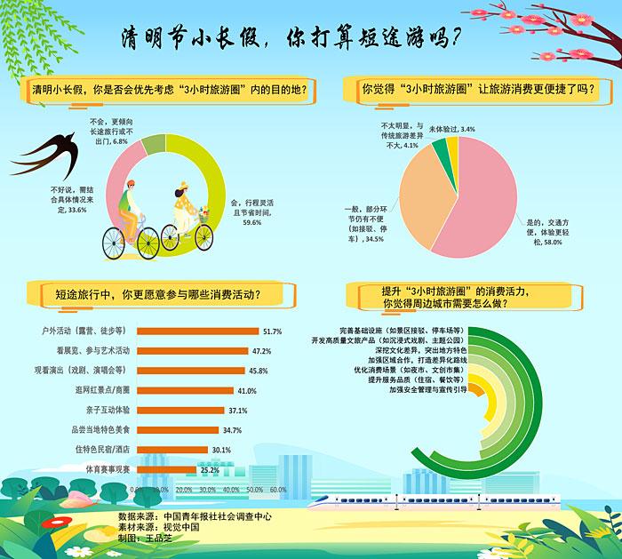 调查显示,在即将到来的清明节小长假,59.6%的受访者会优先考虑“3小时旅游圈”内的出行目的地。