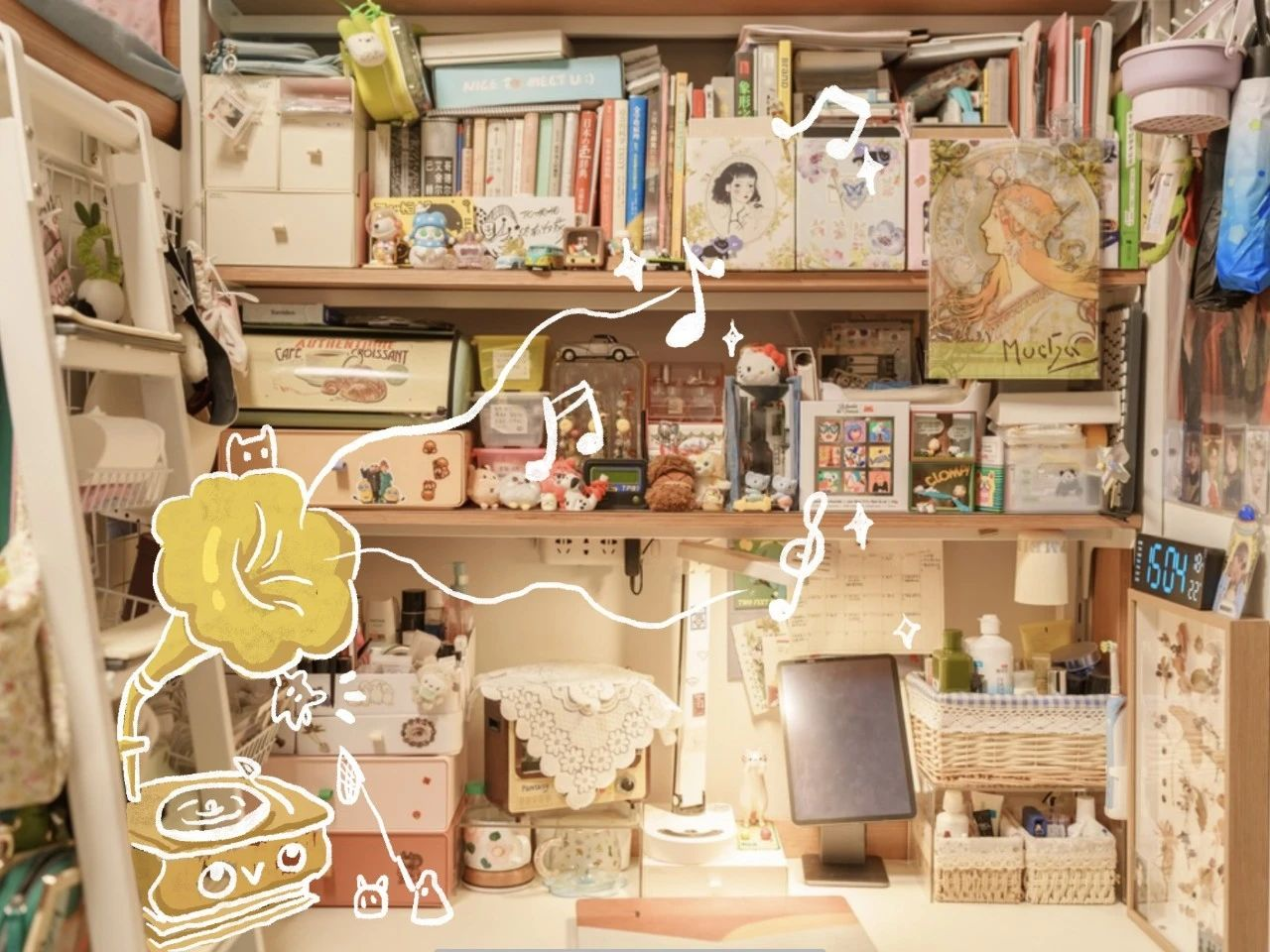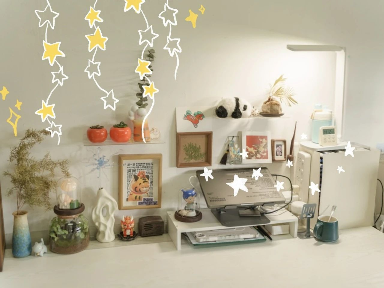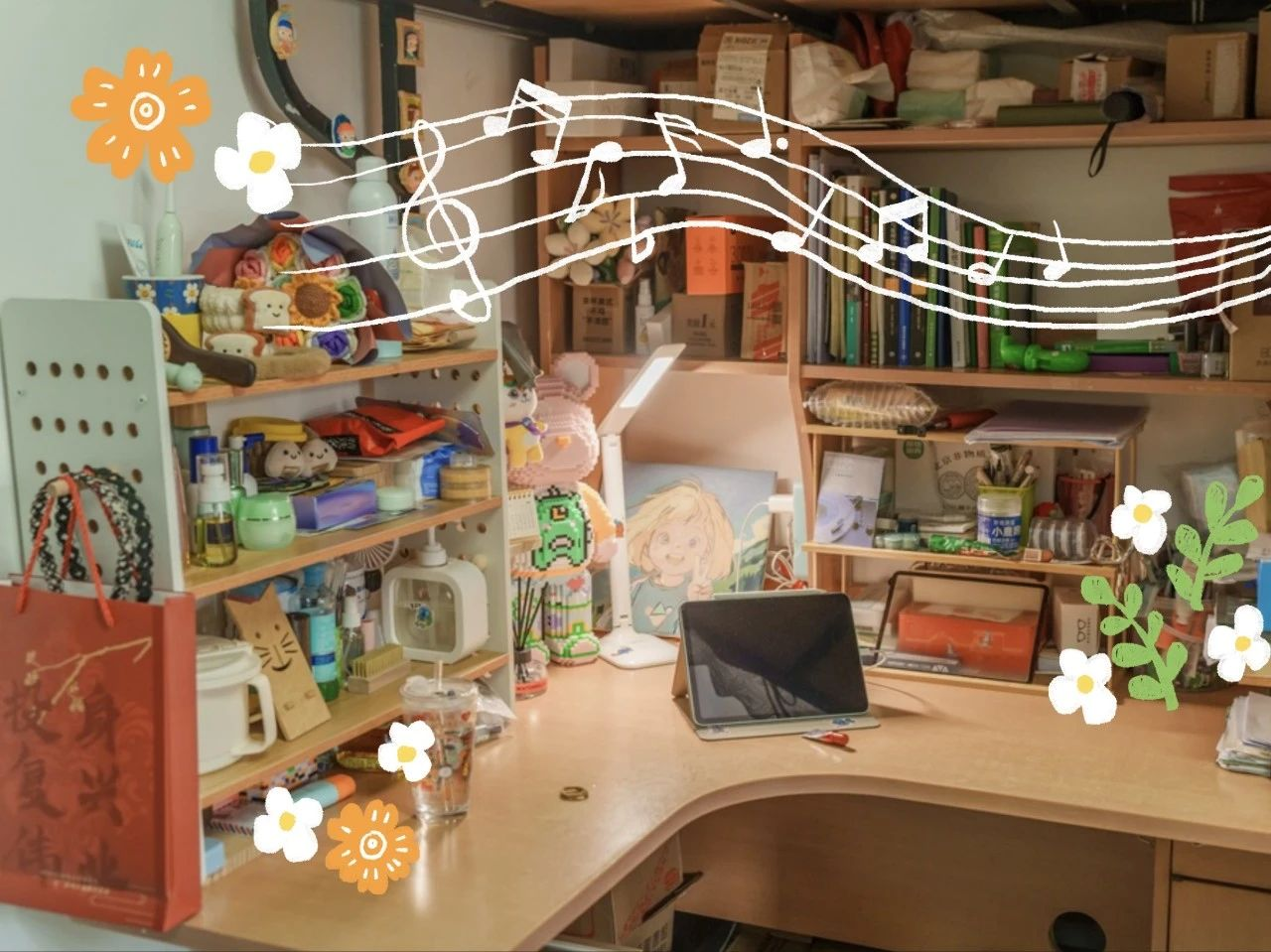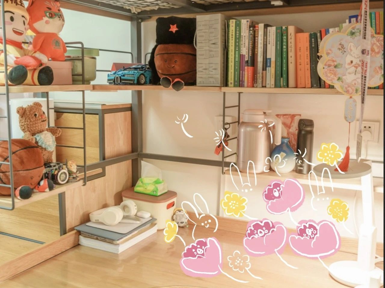 我的书桌积攒了很多小玩意,它们承载着我和清华8年的回忆。我把它们摆在最显眼的位置,疲惫时抬头看一眼便有治愈人心的奇效。为了把八年的家当归置好,将每一寸空间最大化利用:我将日用物品按照自己的使用频率和种类分类收纳,并贴上标签,这样能极大程度降低自己物归原处所需的行动成本。同时,添加一些装饰物兼顾使用效率与美观性。