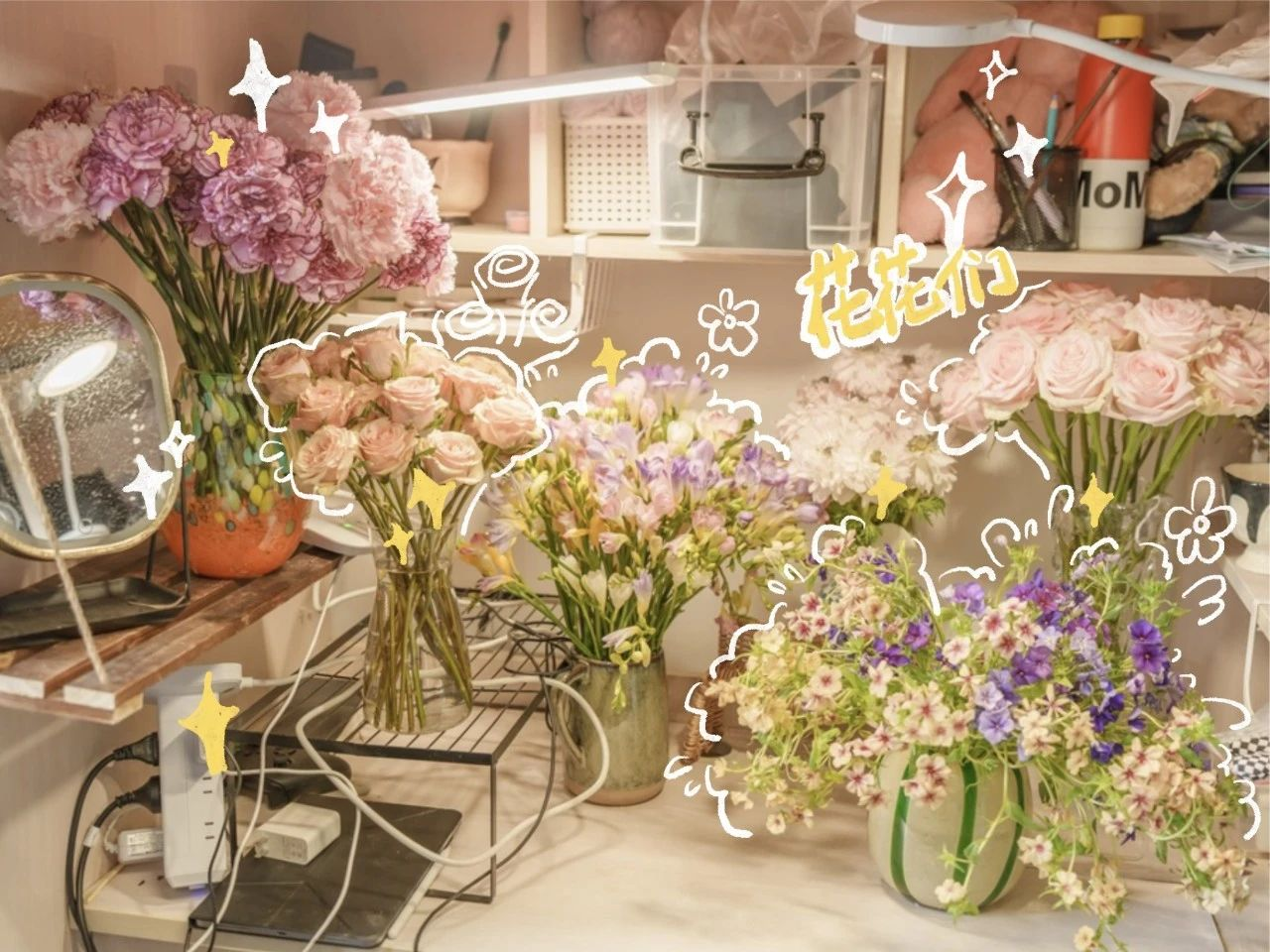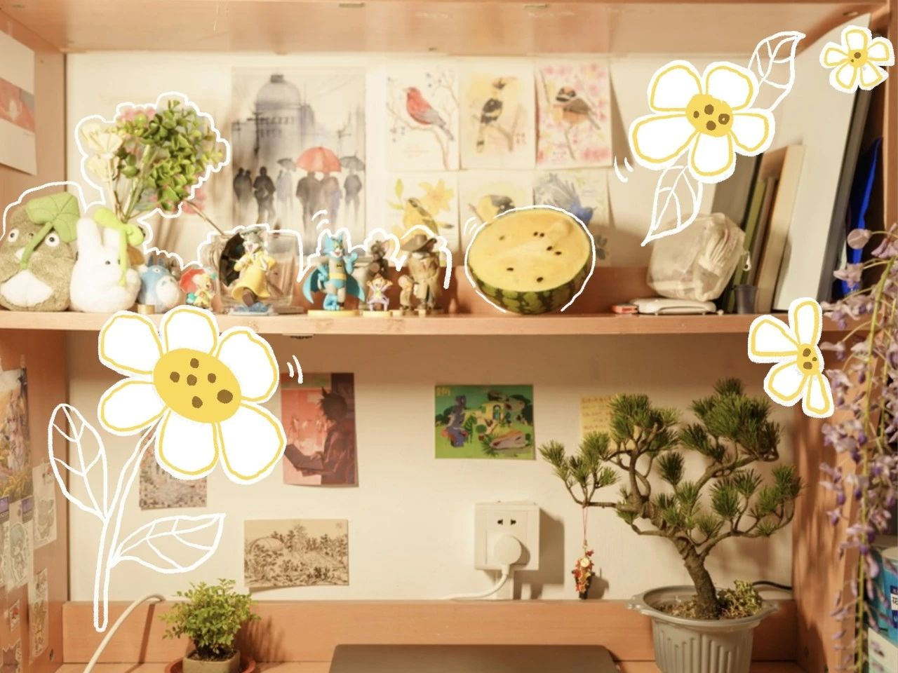 在宿舍里,我养了三十盆植物,紫藤、海棠、绣球交织出一片小小的绿意天地。墙上贴满了自己手绘的画作,植物与色彩交融,营造出静谧又富有生机的氛围。这里不仅是学习的空间,更是灵感的温床,每一天都被自然与艺术轻轻拥抱。