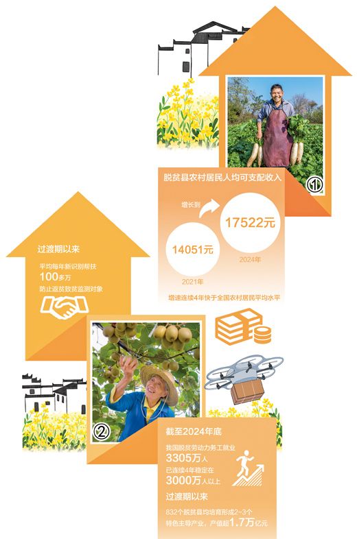 经过4年多接续帮扶,脱贫县基础设施和公共服务持续改善,农村居民人均可支配收入从2021年的14051元增长到2024年的17522元,增速连续4年快于全国农村居民平均水平,脱贫地区与其他地区发展差距、脱贫人口与全国农民收入差距持续缩小,脱贫基础更加稳固、成效更可持续。