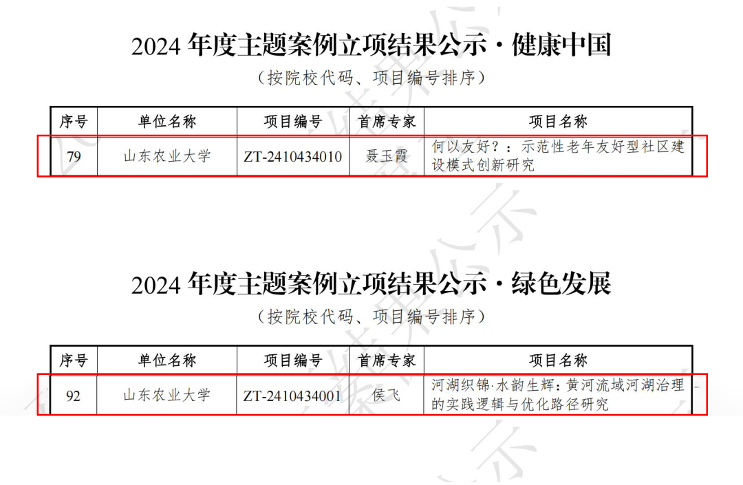 近日,教育部学位与研究生教育发展中心公布了2024年度主题案例立项名单。我校公共管理学院聂玉霞教授的《何以友好?:示范性老年友好型社区建设模式创新研究》和侯飞副教授的《河湖织锦·水韵生辉:黄河流域河湖治理的实践逻辑与优化路径研究》获批立项。