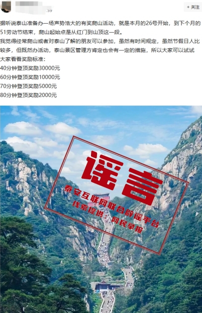 近期,“登顶泰山奖金最高3万”“有奖登山”等信息正在传播。经向泰山景区核查,此活动非泰山景区举办,也未经泰山景区委托或授权,对泰山景区正常旅游秩序形成潜在威胁。
