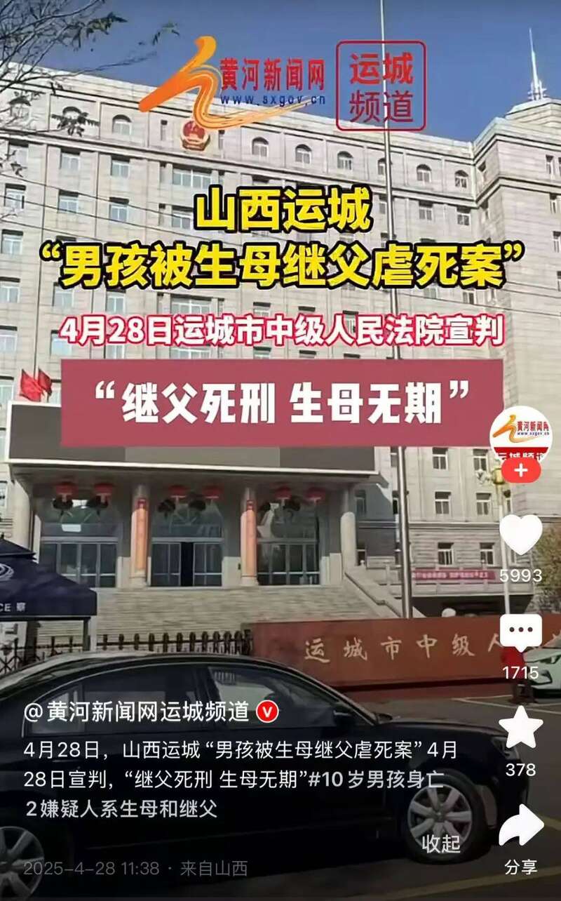 据黄河新闻网运城频道消息,针对山西省运城市“男孩被生母继父虐死案”,运城市中级人民法院4月28日宣判,继父王某某被判死刑,生母谢某某被判无期徒刑。