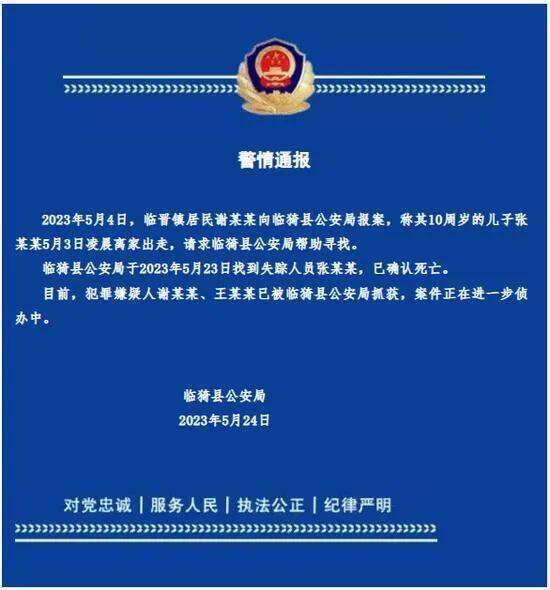 临猗县公安局于2023年5月23日找到失踪人员张某某,已确认死亡。警方抓获的嫌疑人,是张某某的生母谢某某和继父王某某。