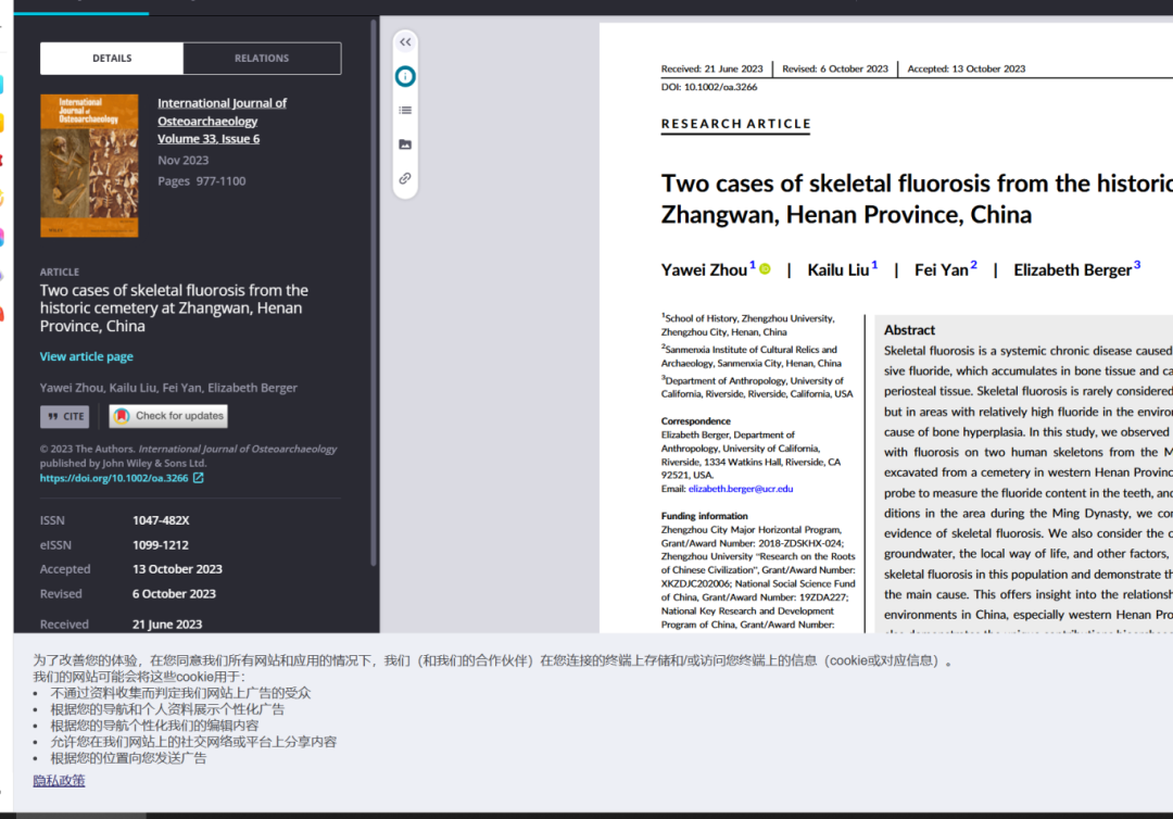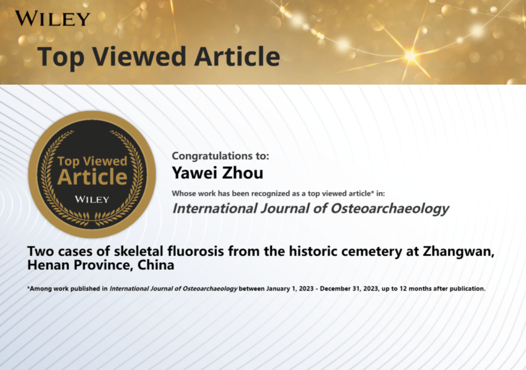近日,郑州大学“中华源”考古实验室团队在国际期刊《国际骨质考古学杂志》上发表的科研论文“Two cases of skeletal fluorosis from the historic cemetery at Zhangwan, Henan Province, China”名列约翰威立国际出版集团(简称Wiley)系列杂志2024年最高阅读量前10%,荣获Wiley杂志高阅读量作者奖。该论文由我校“中华源”考古实验室周亚威教授团队、美国加州大学河滨分校人类学系Elizabeth Berger博士和三门峡市仰韶文化研究中心燕飞馆员合作完成。