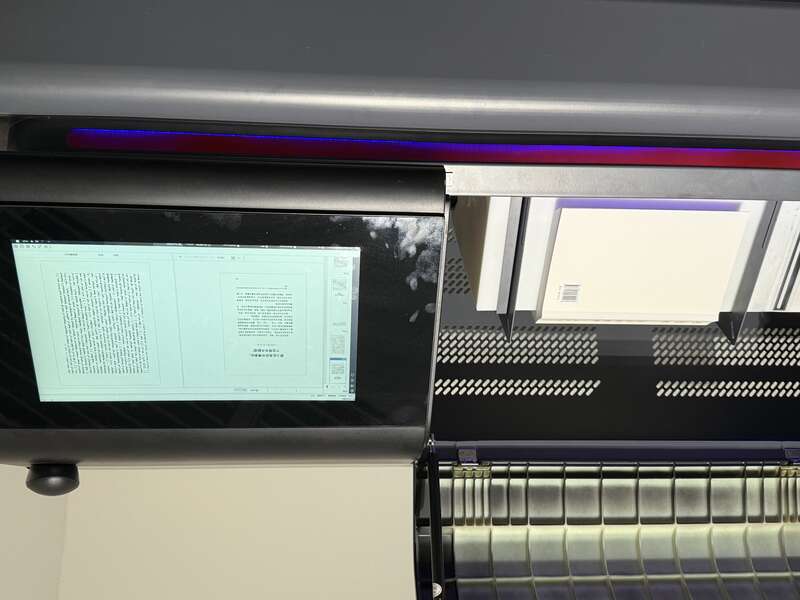 欧日乐克拿起一本样书放入扫描仪演示,该扫描仪采用“风吸翻页”的设计,类似于验钞机,比手动翻页更加轻柔;针对古籍脆弱、易损坏的特点,设备能根据纸张厚度自动调节翻页间距和风的大小,精准识别每一页文字。