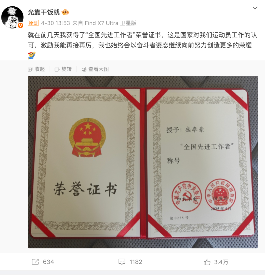 盛李豪表示:这是国家对我们运动员工作的认可,激励我能再接再厉,我也始终会以奋斗者姿态继续向前努力创造更多的荣耀
