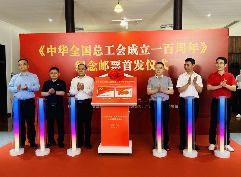 中国青年报客户端讯(中青报·中青网记者 林洁)5月1日,《中华全国总工会成立一百周年》纪念邮票首发活动在广州的中华全国总工会旧址举行。该套邮票一套两枚,图案采用连票设计形式,以红色为主色调。