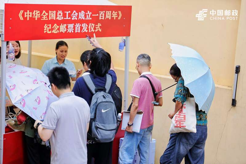 当天,首发仪式现场设置临时邮局,展售《中华全国总工会成立一百周年》纪念邮票首日封、相关新邮产品以及各类文创产品等,并为客户提供免费加盖纪念戳服务。