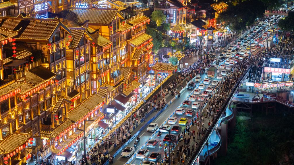 重庆渝中区,洪崖洞景区车水马龙,聚集大量游客。视觉中国 图
