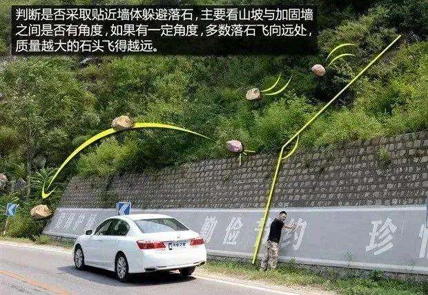 如果路段外侧没有可以躲避的空间,可选择贴近墙体躲避,之后应尽快向落石区域两侧移动,尽可能远离落石。