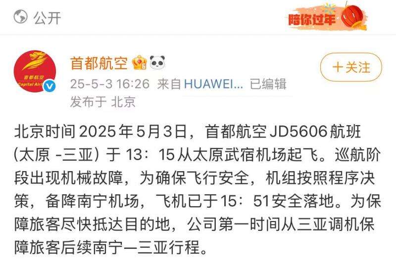 刚刚,首都航空官方微博发布公告,JD5606航班(太原 -三亚) 于13:15从太原武宿机场起飞。起飞后,出现机械故障,为确保飞行安全,机组按照程序决策,备降南宁机场,飞机已于15:51安全落地。为保障旅客尽快抵达目的地,公司第一时间从三亚调机保障旅客后续南宁—三亚行程。