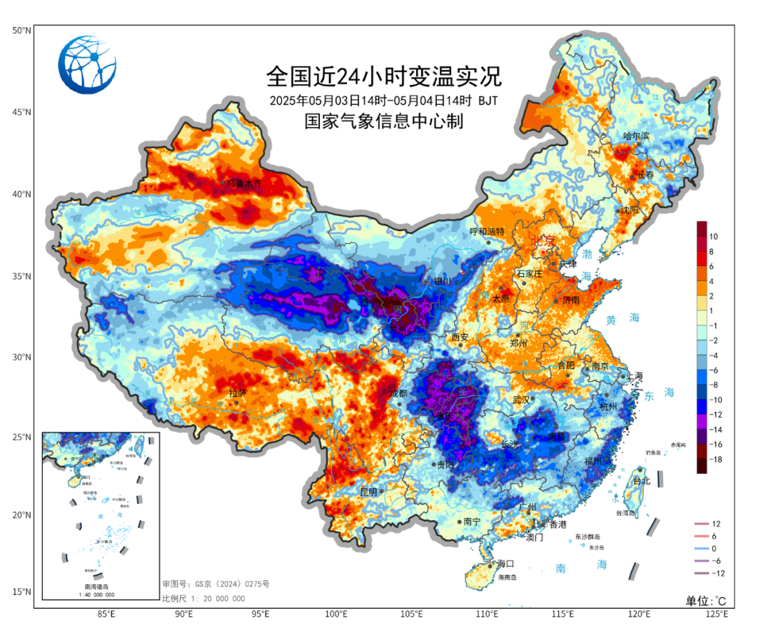 与此同时,未来四、五天,冷空气也仍然活跃,南北方多地气温多起伏。今天白天,降温的核心区转移到长江以南,江汉、江南大部等地出现不同程度降温,其中湖北西部局地降温幅度超过10℃。