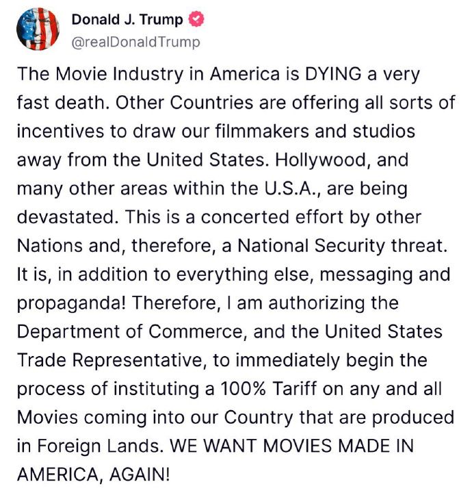 “美国电影业正在急速衰亡。其他国家正提供各种优惠,试图将我们的电影人和制片公司从美国挖走。好莱坞和美国其他许多地区正在遭受重创。这是其他国家的协同行动,构成国家安全威胁,更是一种信息战和宣传战!因此,我授权商务部与美国贸易代表,立即对所有境外制作的要在我们国家上映的电影征收100%关税。我们要让电影重新变成美国制造!”特朗普写道。