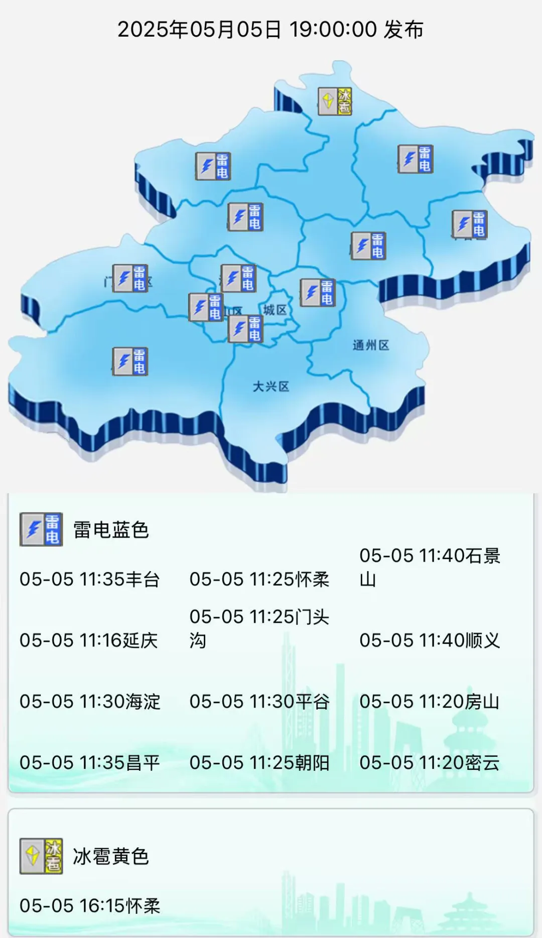 北京市气象台5月5日11时15分已发布雷电蓝色预警信号,请注意防雷避雨和交通安全。