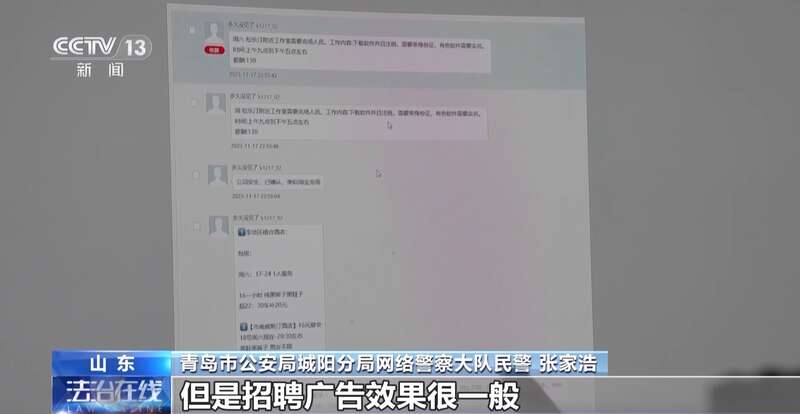 青岛市公安局城阳分局网络警察大队副大队长 王军:高薪招聘、日结资金,对于其中的内容闭口不谈,我们感觉这个信息肯定有问题,正常的招聘广告不会有这种信息。
