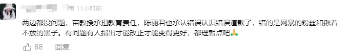 苗怀明表示,还有人专门写了一篇文章论《陈丽君对宝玉的解读无误》,“看这篇文章的评论,可以看到明白人还是有许多。反向捧杀的同时,暴露了自己的无知。本来没多大的事情,书没读清楚可以再多读,话说错了承认错误提升自己就好了,没必要强行洗白,更不能网暴他人。对事情的判断缺乏常识、不讲逻辑、没有是非观念,这样的饭圈文化令人痛心。”