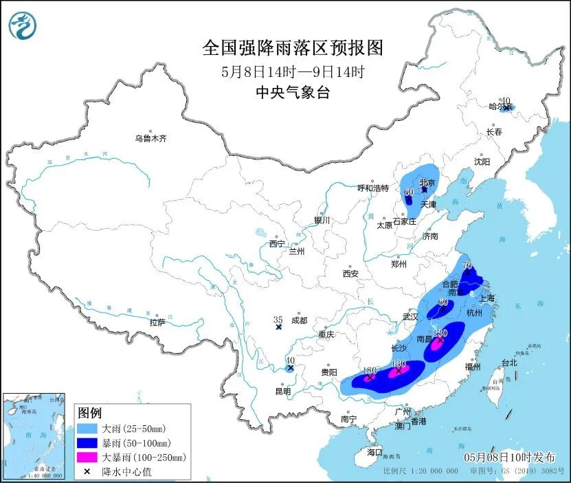 预计5月8日14时至9日14时,江淮南部、江南西南部和中东部、华南北部以及华北中北部等地部分地区有大到暴雨,其中,江西东部、湖南南部、广西北部等地部分地区有大暴雨。上述部分地区伴有短时强降水,局地有雷暴大风冰雹等强对流天气。