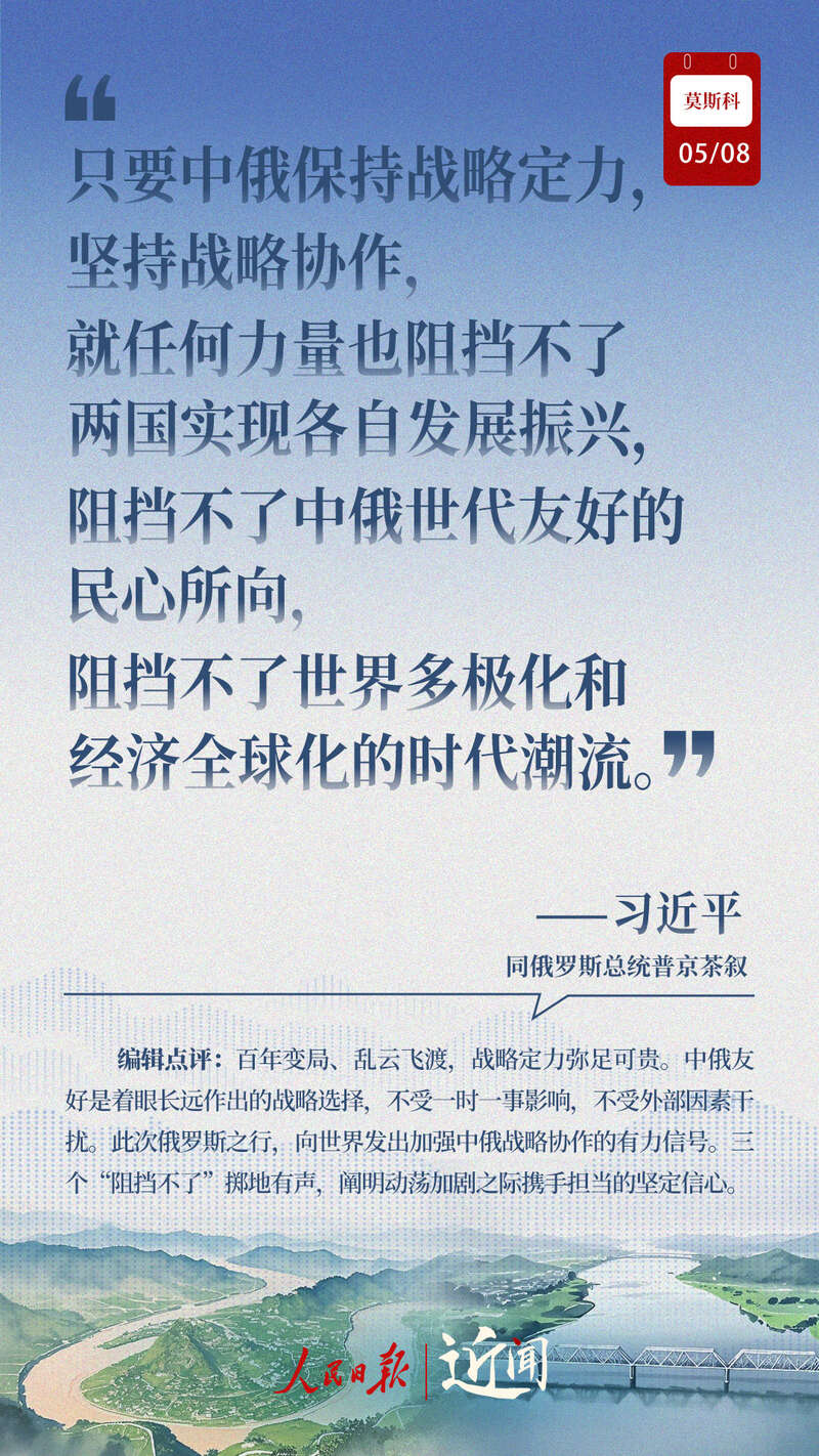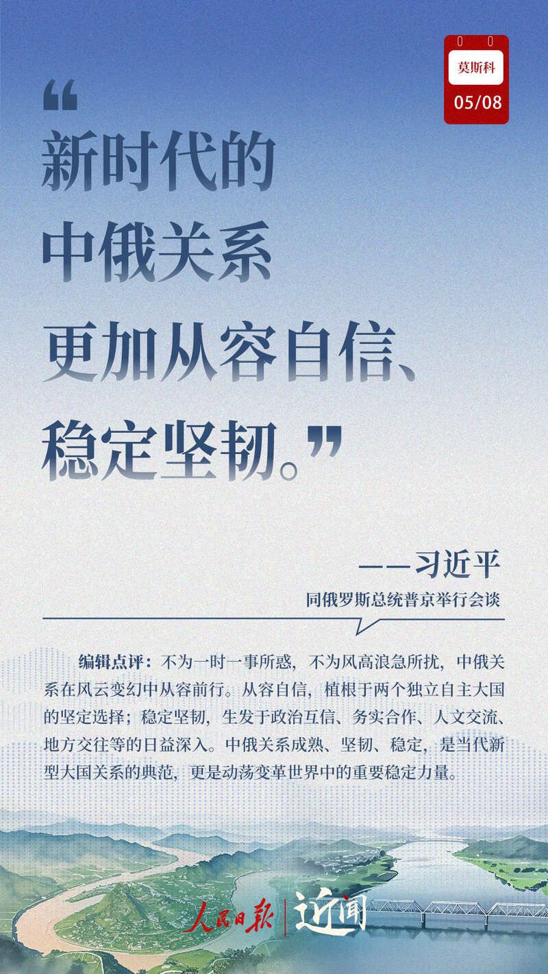 做百炼成钢的真朋友、彼此成就的好伙伴、国际秩序的捍卫者、全球治理的引领者,在纪念中国人民抗日战争、苏联伟大卫国战争胜利和联合国成立80周年之际,中俄新时代全面战略协作伙伴关系进一步深化。