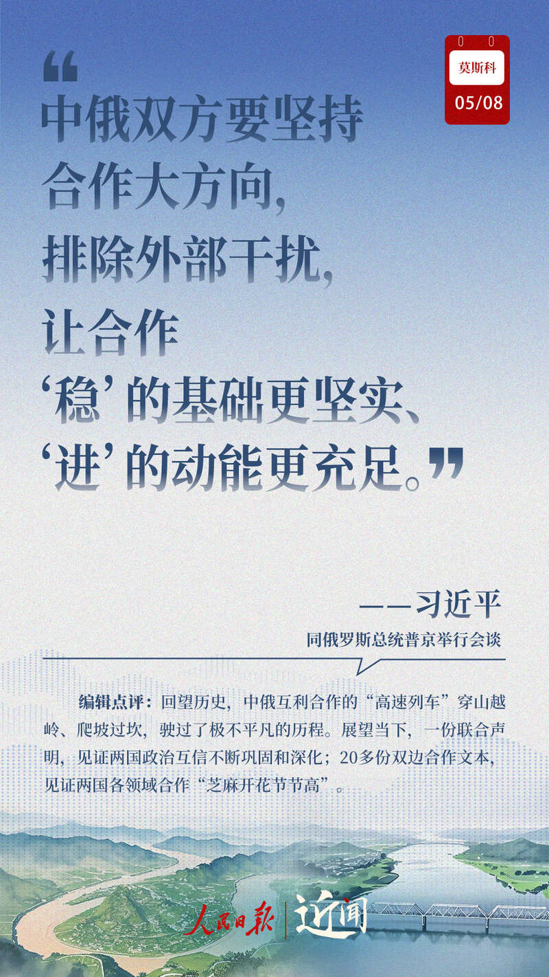 当地时间5月8日,习近平主席出席普京总统举行的欢迎仪式、小范围会谈、大范围会谈、签字和合作文本交换仪式、共见记者、茶叙,两国元首不同形式的长时间交流,引领中俄关系登高望远。