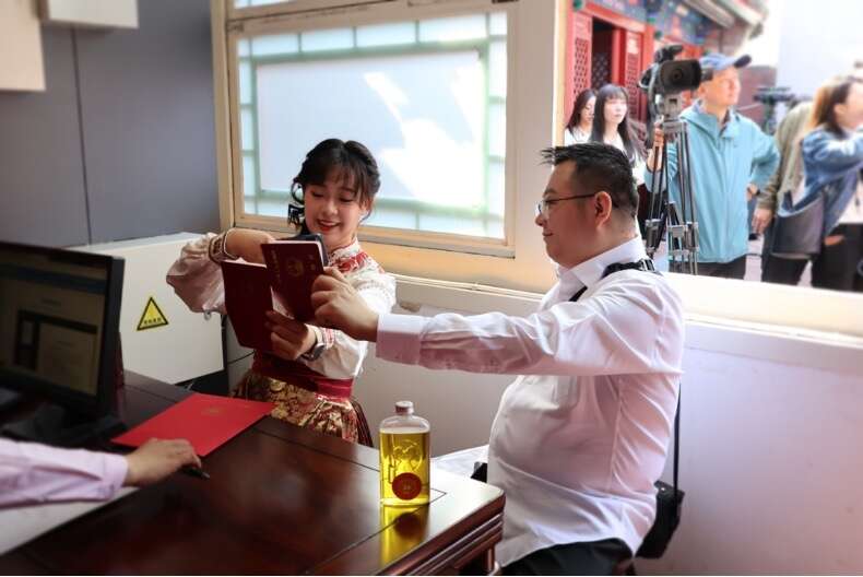 耿碧莹和翟岩是北京市首对在户外婚姻登记中心完成登记的新人。“跟我想象的很不一样,在户外领证的体验很新奇,好像历史和古建见证着我们的爱情。”耿碧莹说,“全国通办”政策的实施让她无须返回黑龙江,“领证变得非常方便和简单。”