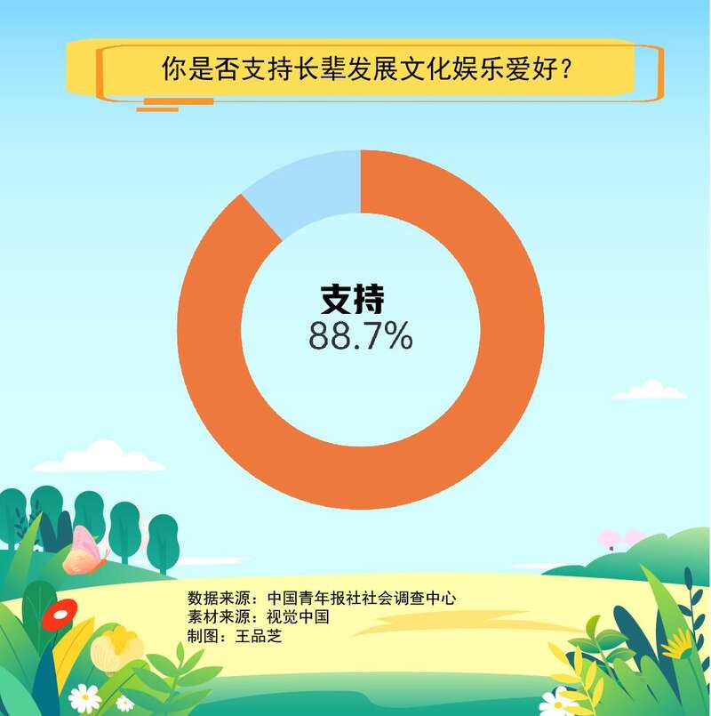 调查中,88.7%的受访者支持长辈发展文化娱乐爱好,其中41.9%的受访者非常支持。