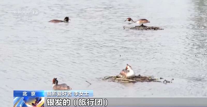 摄影爱好者 张先生:这两年凤头䴙䴘开始在公园筑窝,观鸟的人就多了,尤其是今年。前年只有一窝,去年有四窝,今年至少有六七窝凤头䴙䴘。