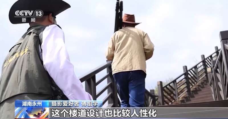 摄影爱好者 傅祖学:我们在观鸟之余,还可以顺着楼道爬到山顶看风景,这个楼道设计也比较人性化,每隔几十米就有一个休憩的平台,爬累了就休息一会儿。