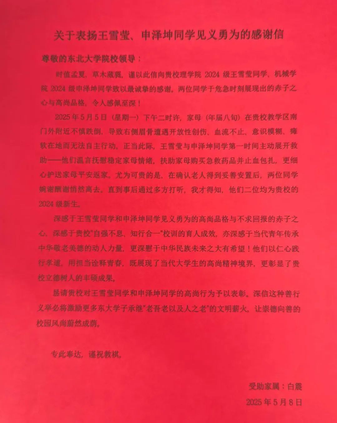 家属白震在感谢信中饱含深情地写道:“深感恩于王雪莹同学和申泽坤同学见义勇为的高尚品格与不求回报的赤子之心。”字里行间,不仅有对两位同学善举的诚挚感激,更有对东北大学“自强不息、知行合一”校训育人成效的高度认可,以及对当代青年传承中华敬老美德的欣慰与赞赏。