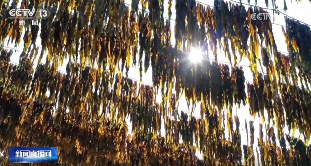 从空中俯瞰,成排钢索从半山腰铺架下来,层层叠叠的海带如绿色瀑布倾泻。与传统地面晾晒相比,这种立体挂晒的方式通风性更好,能缩短晾晒周期,还能减少泥沙附着,保持海带洁净干爽,提升海带品相。