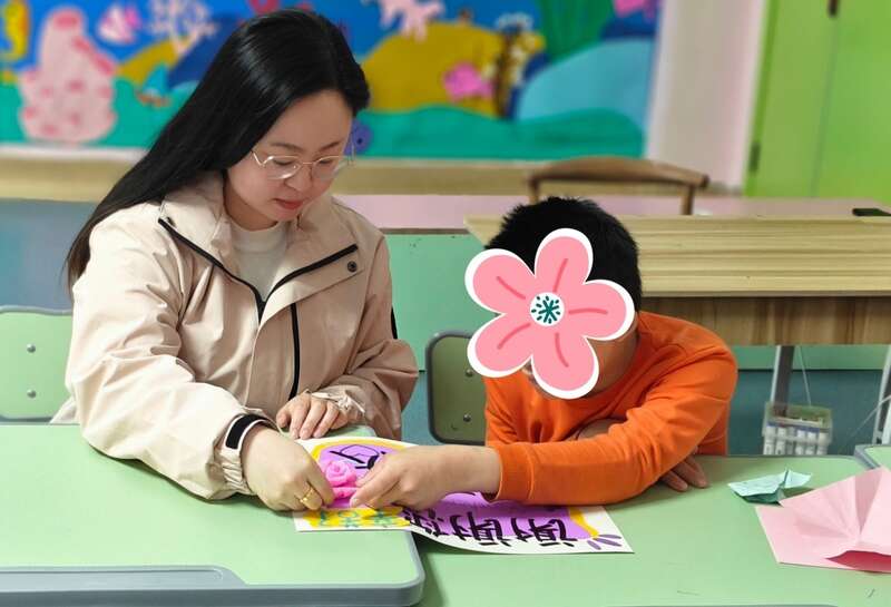 一名孩子在特教老师的帮助下,为“妈妈”亲手制作贺卡。(王春晖 摄)
