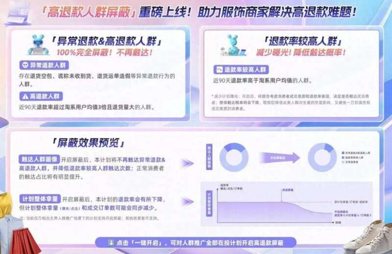 来自网络平台的截图显示,淘宝商家在进行人群推广时,可以开启“高退款屏蔽”功能设置屏蔽人群。可100%屏蔽存在退货空包、谎称未收到货、退货运单造假等异常退款人群,以及近90天退款率超过淘系用户均值3倍且退货量大的高退款人群。