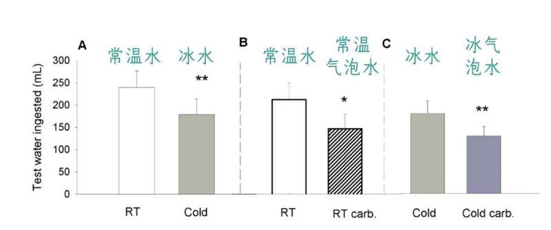 不仅低温的物理冰感可以解渴,化学诱导的口腔冰感和舔冰的金属块也有类似的效果。此外,碳酸化进一步增强了冰水的解渴特性,因为二氧化碳强化了冷水的冰感和刺激性,加强了传递给大脑的喝水信号,感受到的液体量也被“放大”。