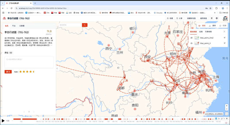 该中心主任徐永明教授在云四库数据地图中,输入“李白”,系统便将李白从公元701年出生至762年去世的动态轨道图,包括他在不同时间节点的社会活动情况等展示出来。比如,点进公元723年显示:李白23岁,在四川江油匡山读书,同年二月,他的朋友张说兼中书令。