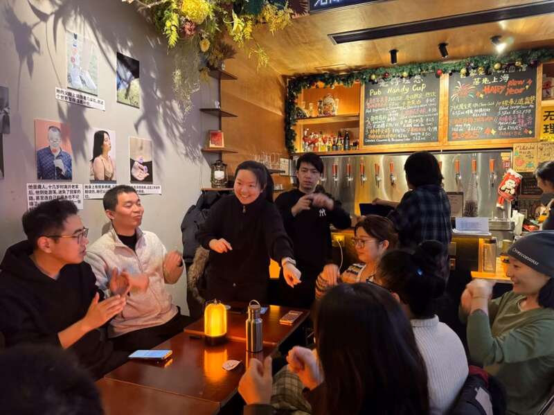 几个月后,程菲菲和听人朋友木木一起在酒馆办了手语版狼人杀游戏夜。现场有手语翻译做聋人、听人之间的桥梁,还专门请了一位手语语言学研究生给毛毛做口述者。口述者全程坐在毛毛身边,在一开始的手语教学环节,她会边讲、边手把手教毛毛比划手语单词。游戏开始后,口述者会告诉毛毛现在是几号玩家在发言;哪个玩家用手指了指谁,他实际上是在表示什么——这些是无法听到的细节。毛毛这次的体验是“完美”,活动结束后他和程菲菲说,自己如果再多学些手语,就能更多地跟大家互动了。