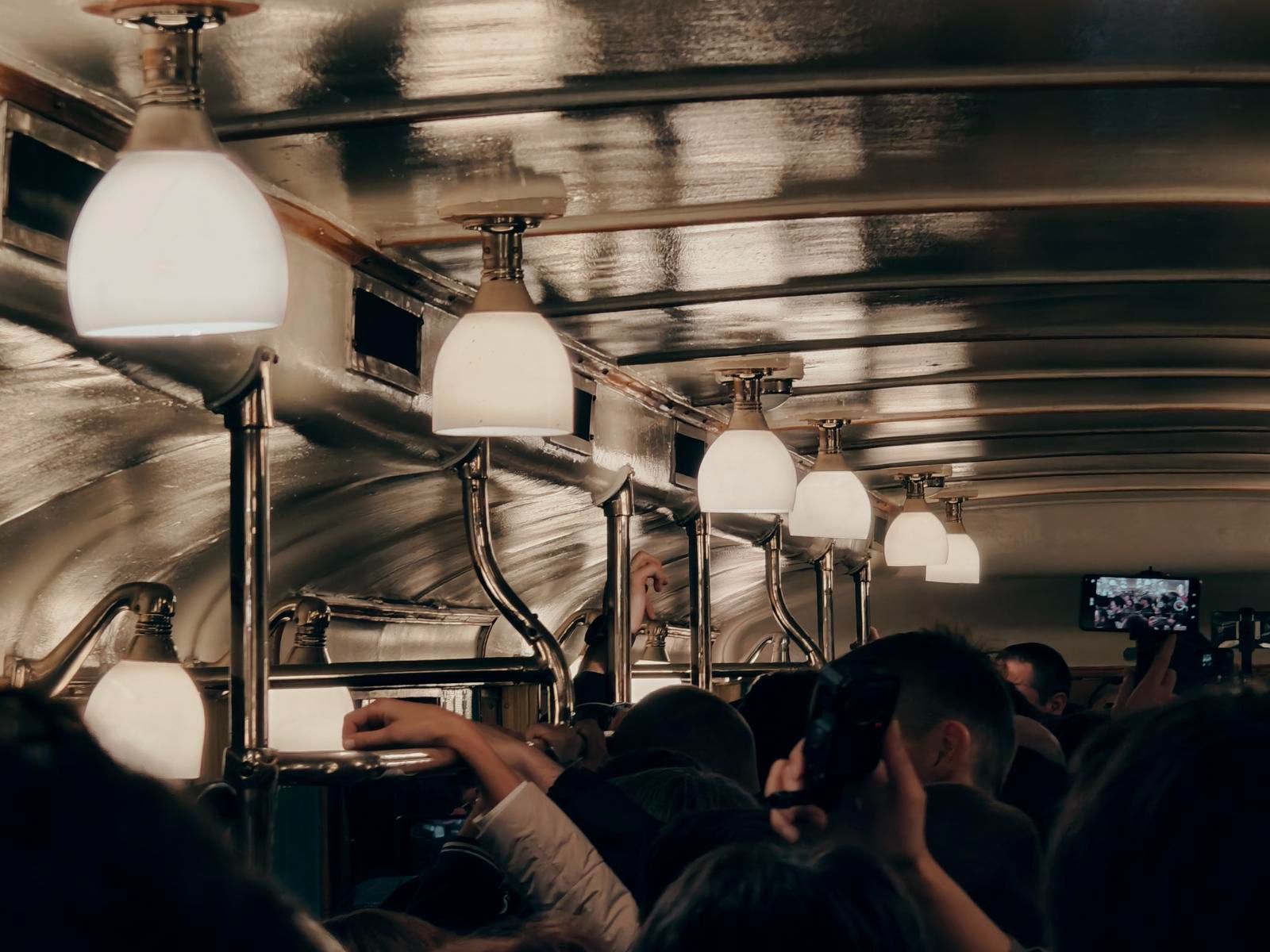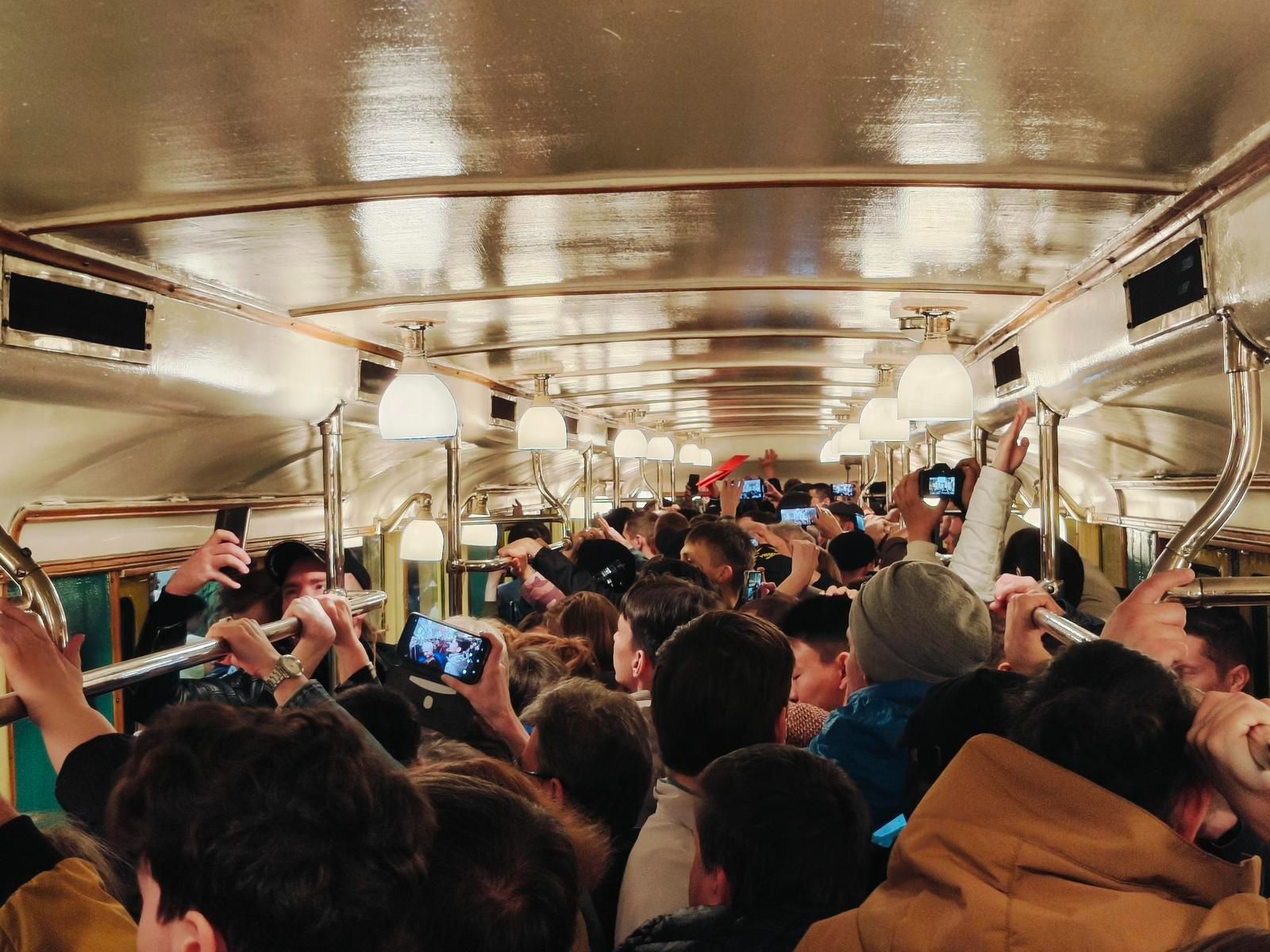 5月15日,俄罗斯莫斯科,莫斯科庆祝地铁开通90周年,莫斯科地铁公司于当日推出90周年主题纪念列车,图为列车内拥挤的人群。中青报·中青网驻俄罗斯记者 赵祺/摄