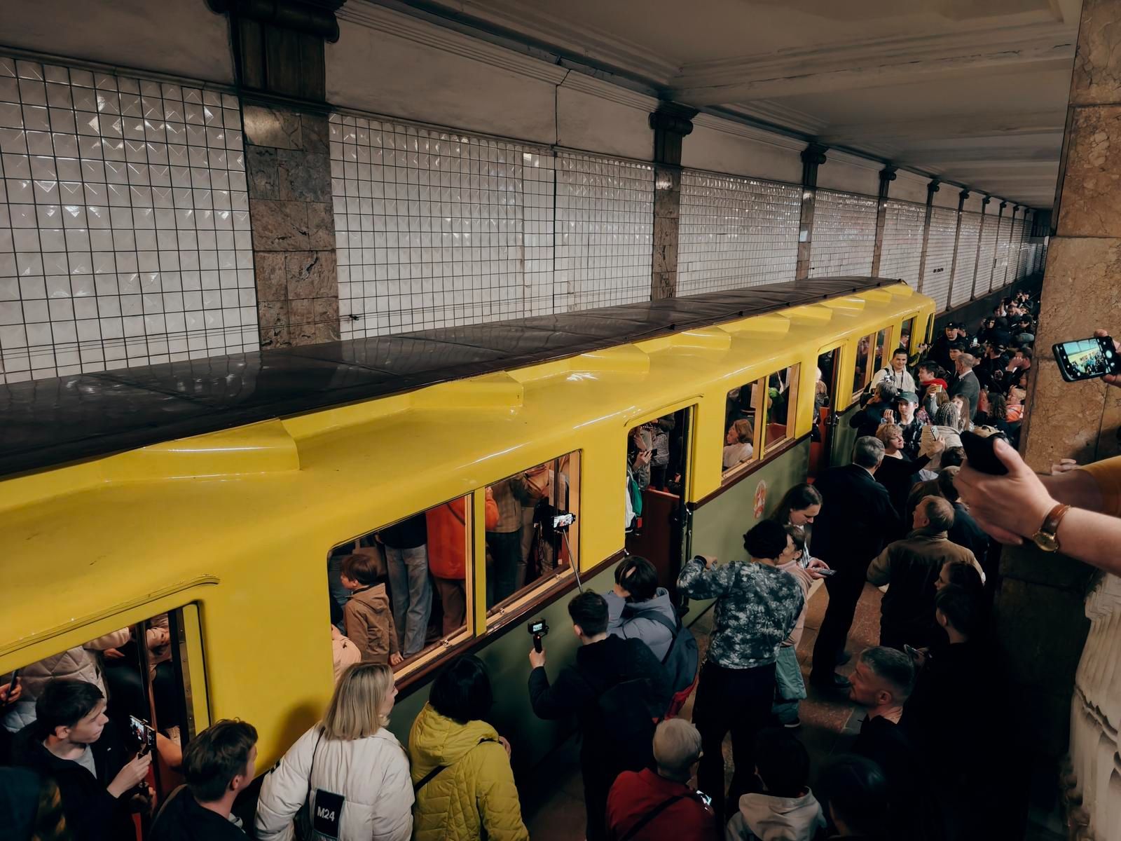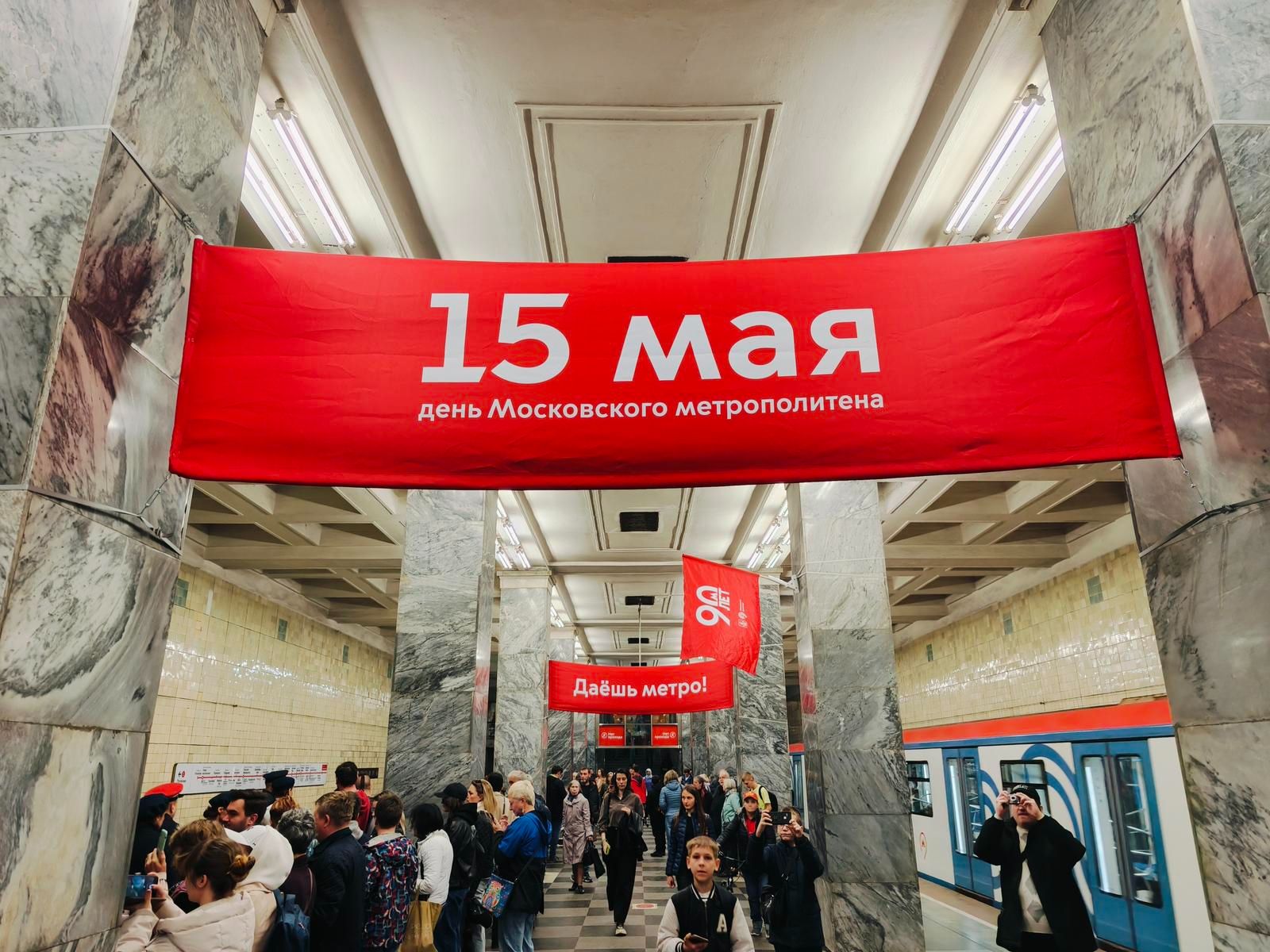 5月15日,俄罗斯莫斯科,莫斯科庆祝地铁开通90周年,莫斯科地铁公司于当日推出90周年主题纪念列车,记者和莫斯科市民一同搭乘纪念列车。中青报·中青网驻俄罗斯记者 赵祺/摄