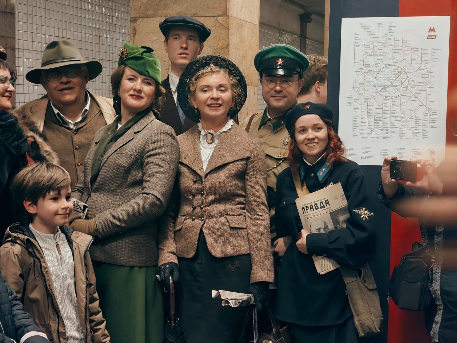 5月15日,俄罗斯莫斯科,莫斯科庆祝地铁开通90周年,莫斯科地铁公司于当日推出90周年主题纪念列车,图为群众演员身穿90年前的服饰,准备搭乘“首班列车”。中青报·中青网驻俄罗斯记者 赵祺/摄