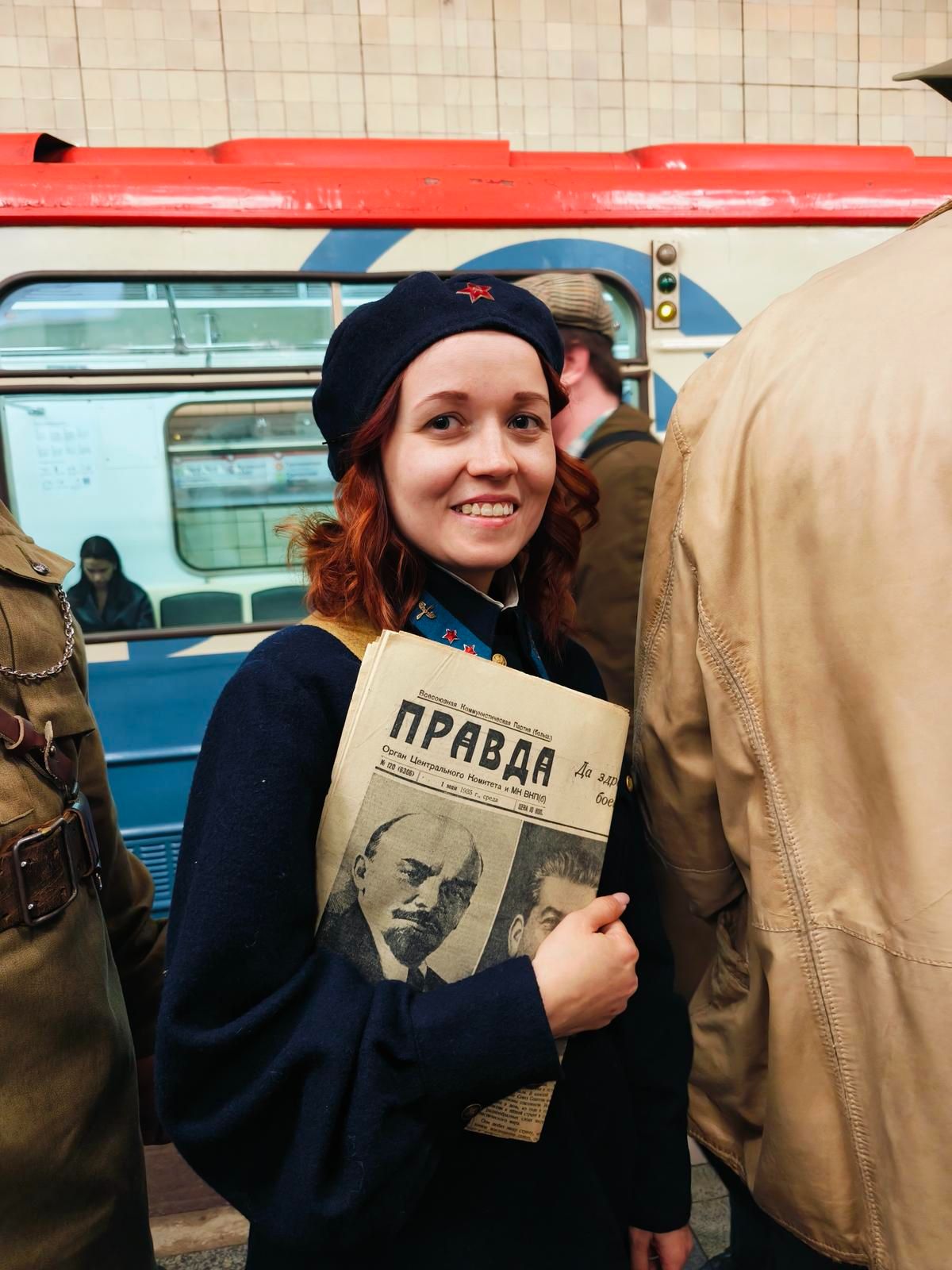 5月15日,俄罗斯莫斯科,莫斯科庆祝地铁开通90周年,莫斯科地铁公司于当日推出90周年主题纪念列车,图为一名女孩身着苏联服饰手持一张1935年苏联《真理报》的复制品。中青报·中青网驻俄罗斯记者 赵祺/摄