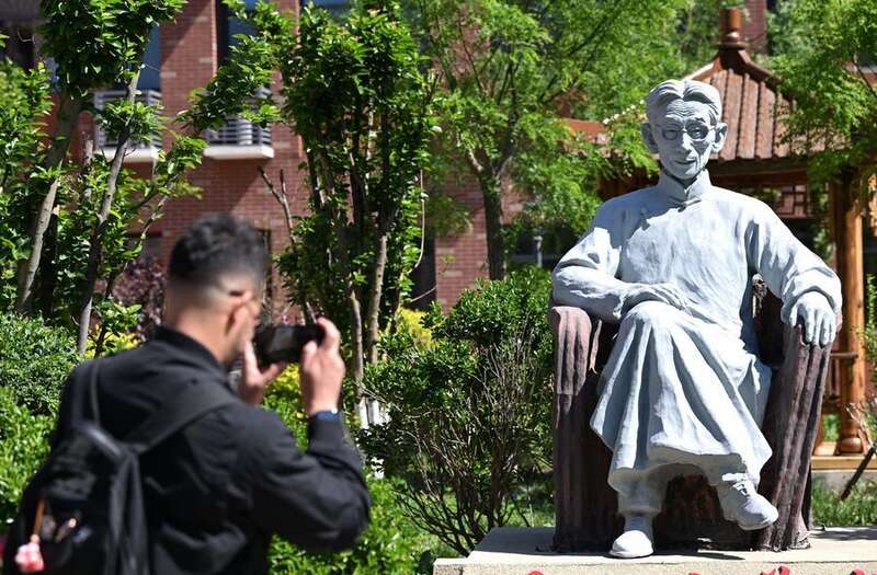 4月24日,吴瑞龙在天津市东丽区金桥养老中心(马三立老人院)用手机拍摄马三立的雕像。