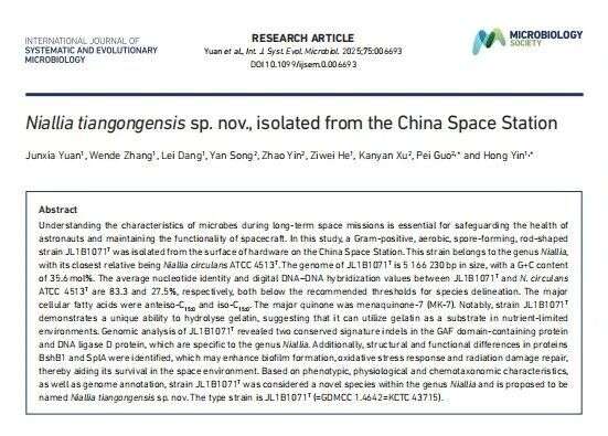 近日,科研人员首次公布在我国空间站发现的一个微生物新物种,并将其命名为“天宫尼尔菌(Niallia tiangongensis)”,相关科研成果在线发表于国际权威期刊《International Journal of Systematic and Evolutionary Microbiology》上。