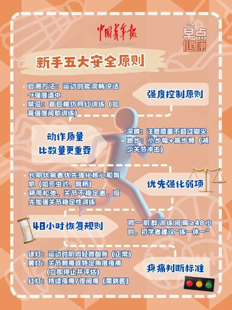“最好的第一次运动,是让你还想第二次的运动。”国家体育总局运动医学研究所运动康复研究中心主任张乐伟说。安全运动的核心是尊重身体信号,用科学代替蛮力。他建议,应从最小有效运动量开始,逐步升级。“运动损伤不是偶然,而是错误积累的必然,做好细节管理,才能长期受益。”