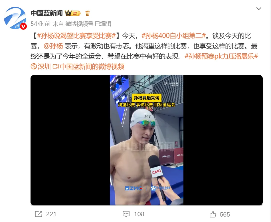 谈及今天的比赛,孙杨表示,有激动也有忐忑。他渴望这样的比赛,也享受这样的比赛。最终还是为了今年的全运会,希望在比赛中有好的表现。