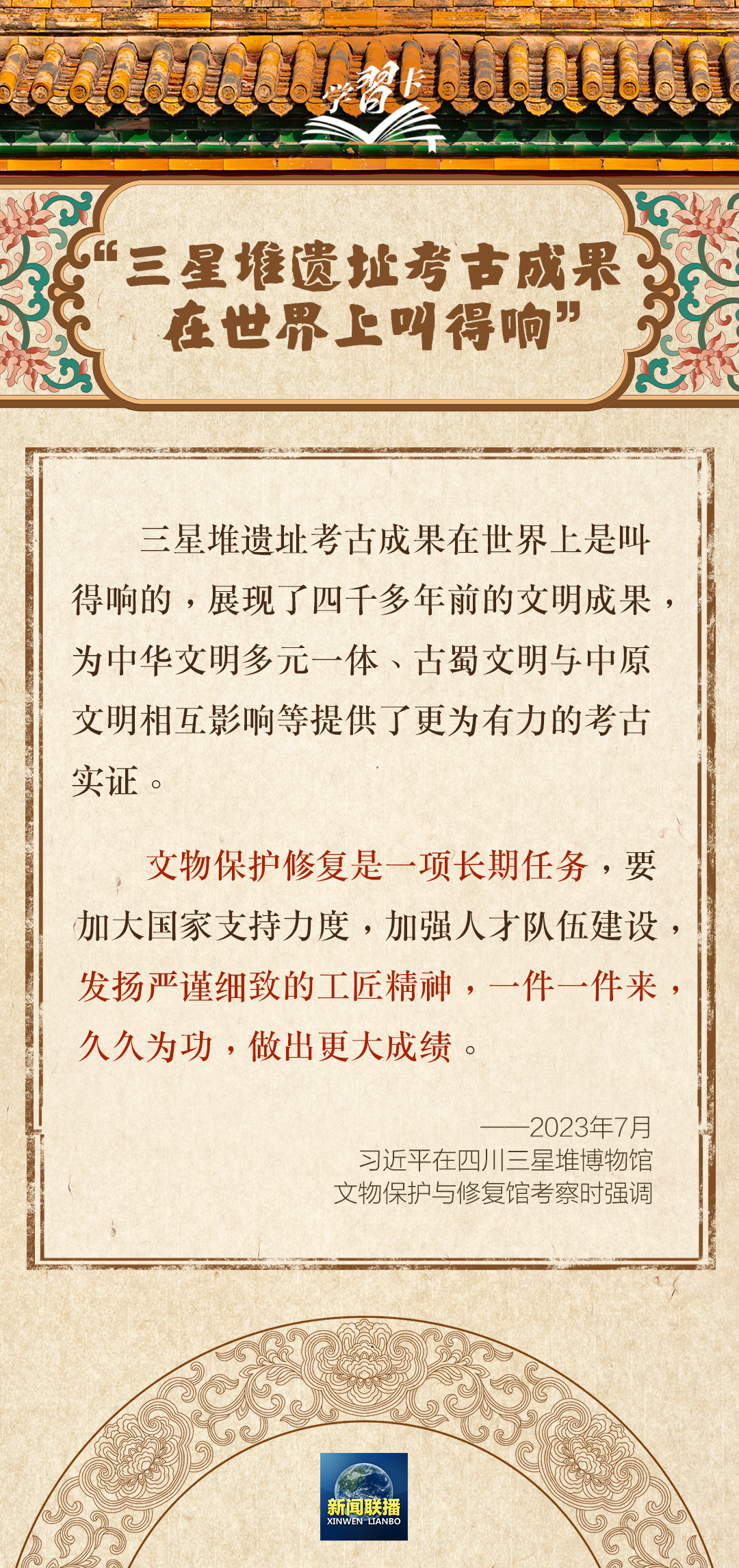 习近平总书记一直高度重视博物馆工作,经常“打卡”博物馆,察看具有浓郁文化色彩的展品,对文物保护和文化传承工作作出重要部署。