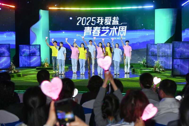 青年代表们以心形光束棒开启2025“我爱盐”青春艺术周。主办方供图