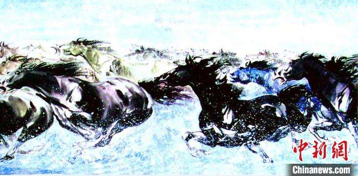 姚迪雄笔下的骏马图中,有在广袤草原上自由驰骋的天马,有与维吾尔族姑娘共舞的马驹,还有与牧民们朝夕相伴、共同劳作的马队。姚迪雄说,伊犁牧民们的生活离不开马。伊犁的牧民们赶着马匹、带着毡房转场,生活虽然艰苦,但脸上总是洋溢着笑容。