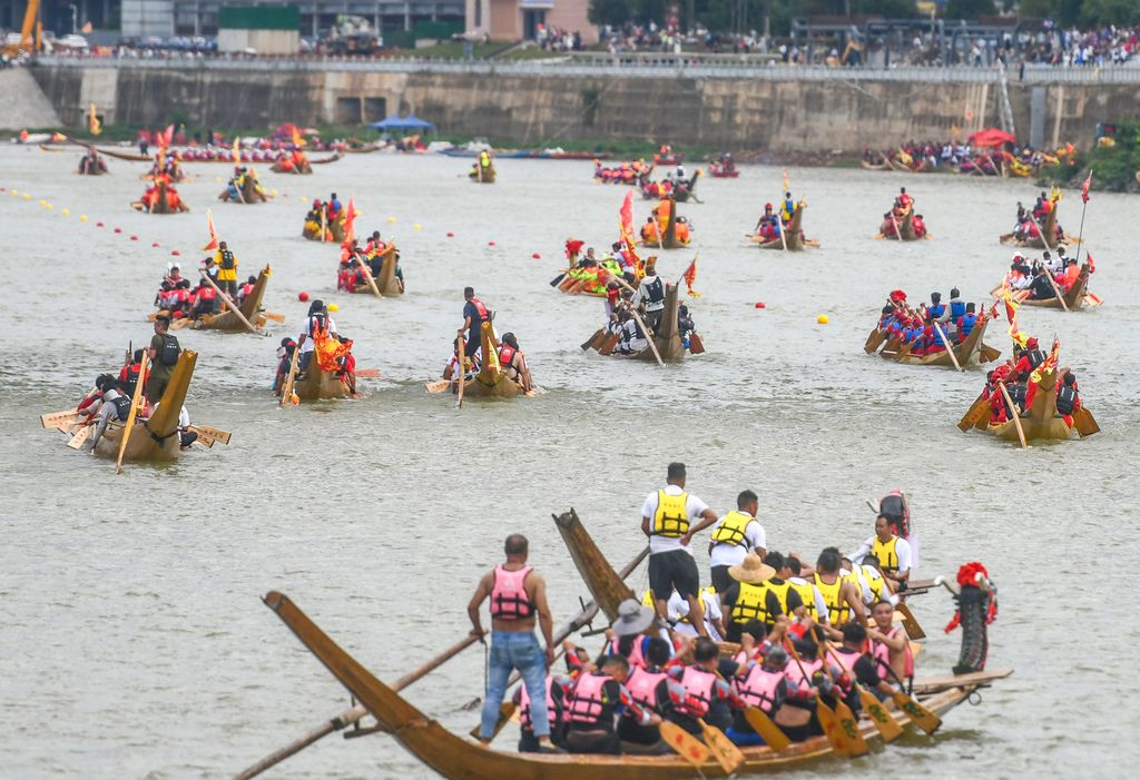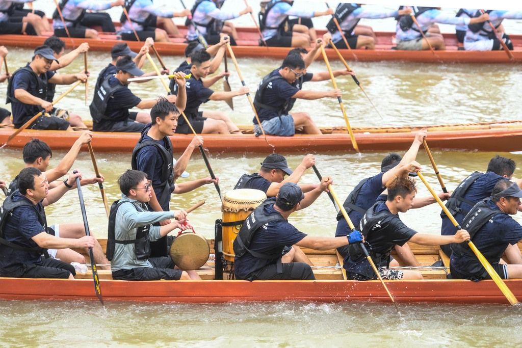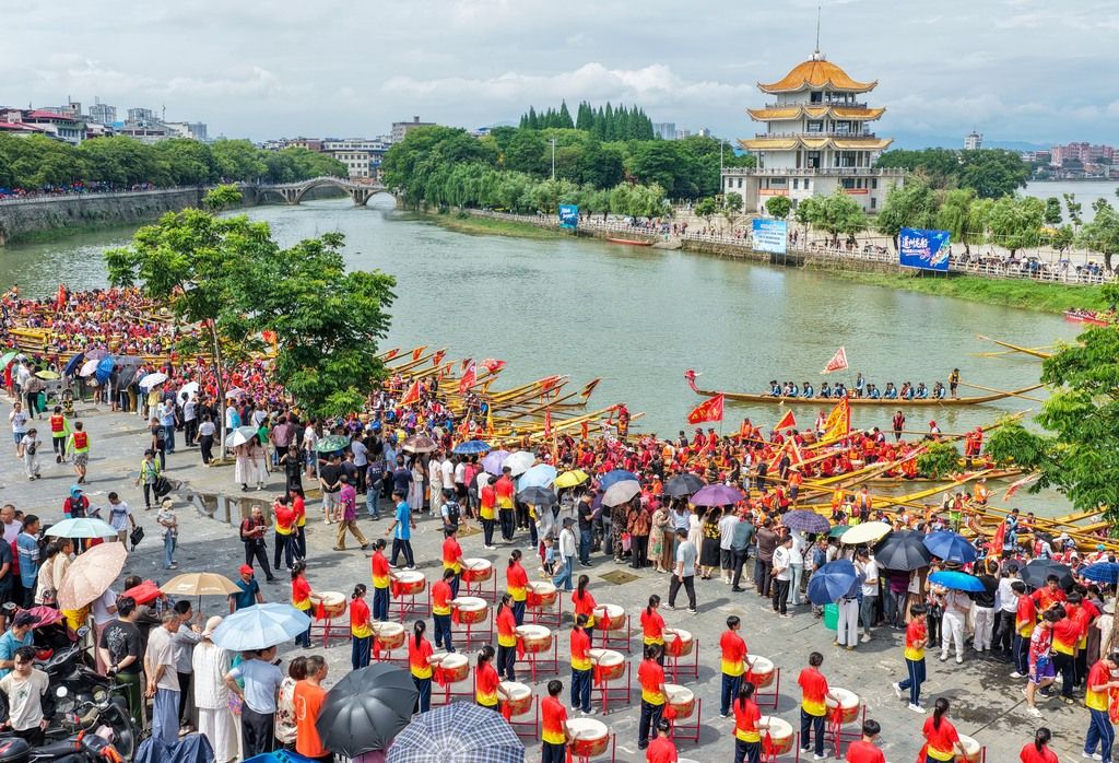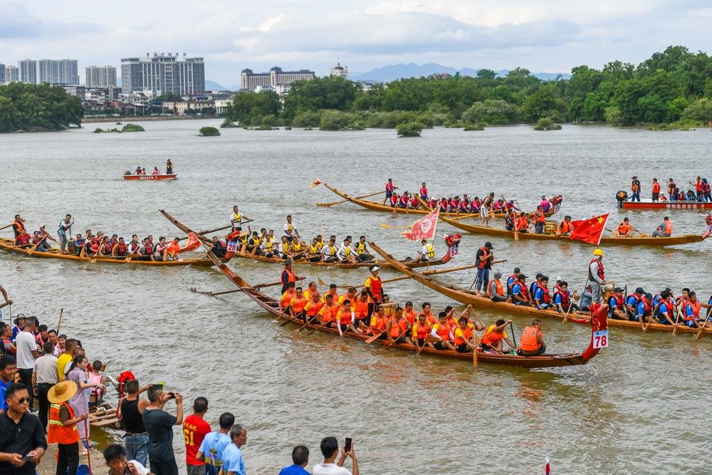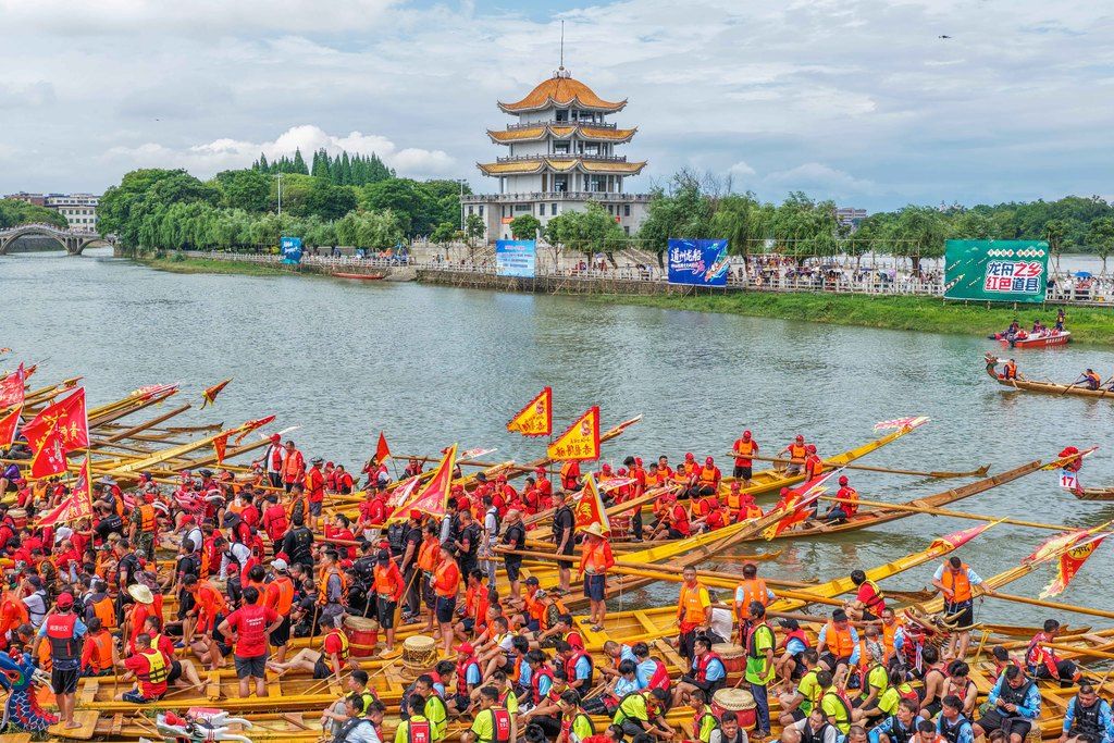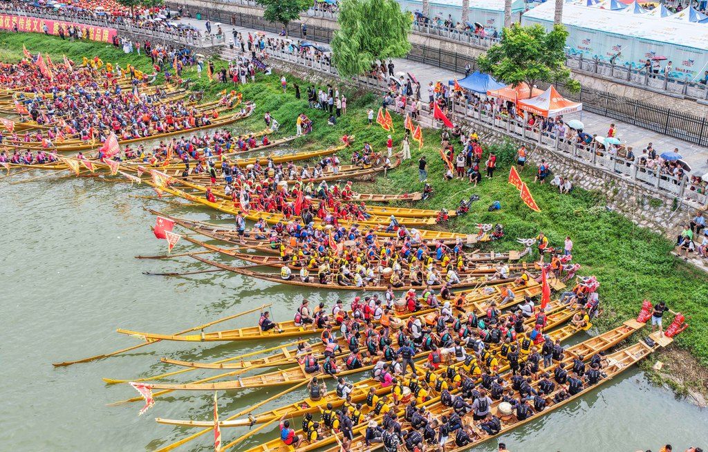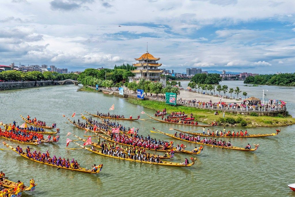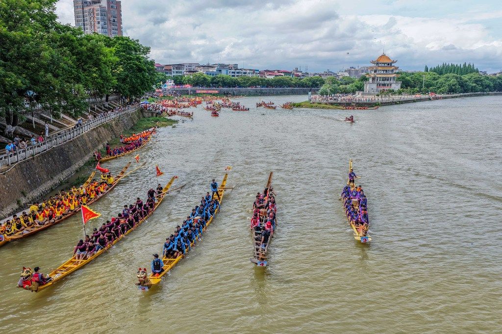 2025年5月20日,湖南省永州市道县城区,龙船队在潇水河上行进。端午节临近,道县举行国家非遗龙船巡游,百条龙船在潇水河上行进,迎接佳节到来。